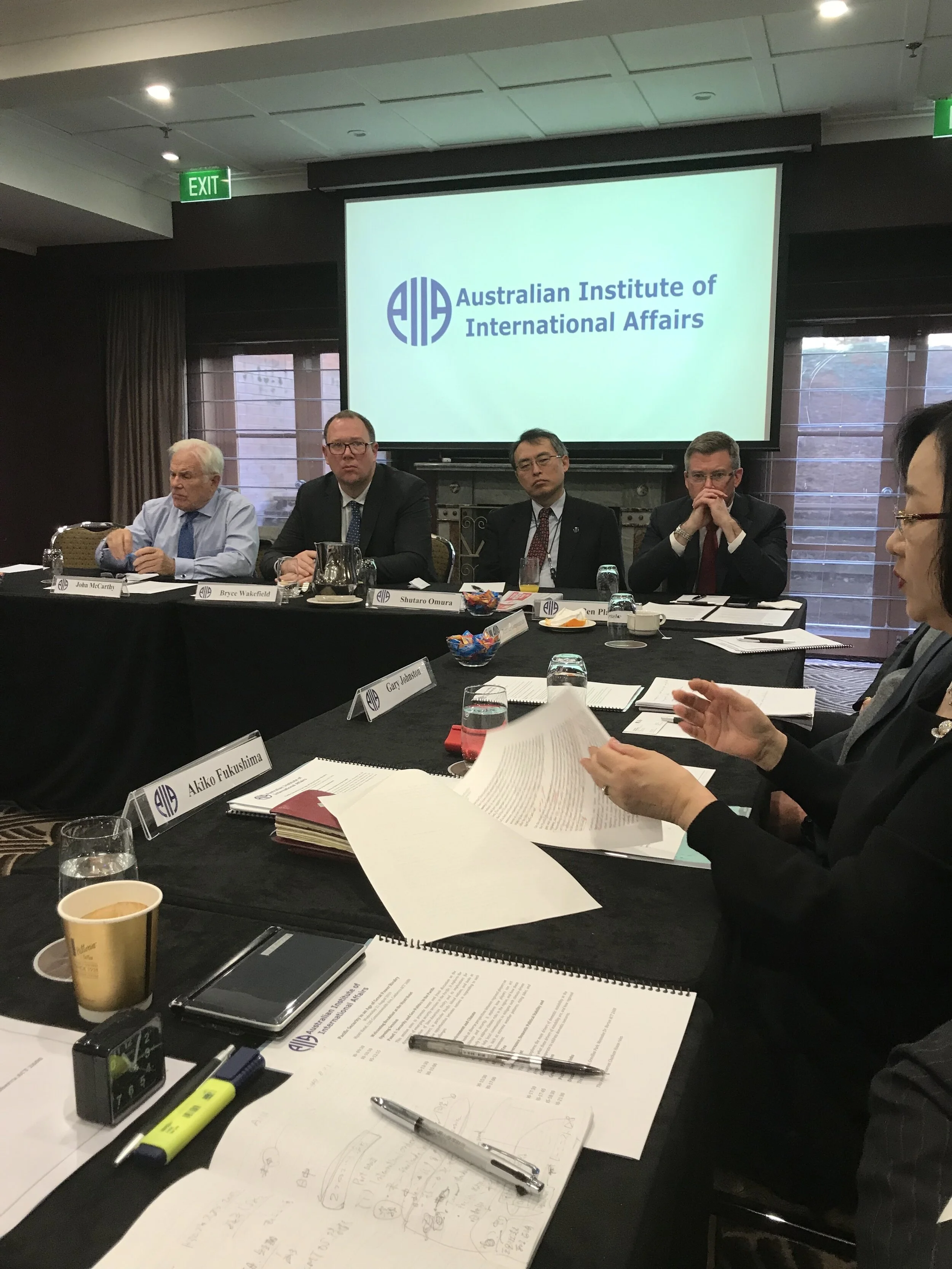 The opening session started with a presentation from Mr. Sonoura Kentaro (Special Advisor to Prime Minister Abe) discussing Japan’s position and role in the region. The event was managed by Dr. Bryce Wakefield (AIIA national Director) which included pre-event dinner at the Japanese Ambassador’s residence, lunch and catered dining during the event at the Hyatt Hotel, and a formal post-event dinner. Some of the invited speakers were further arranged to share their research contributions at other branches of AIIA around Australia.